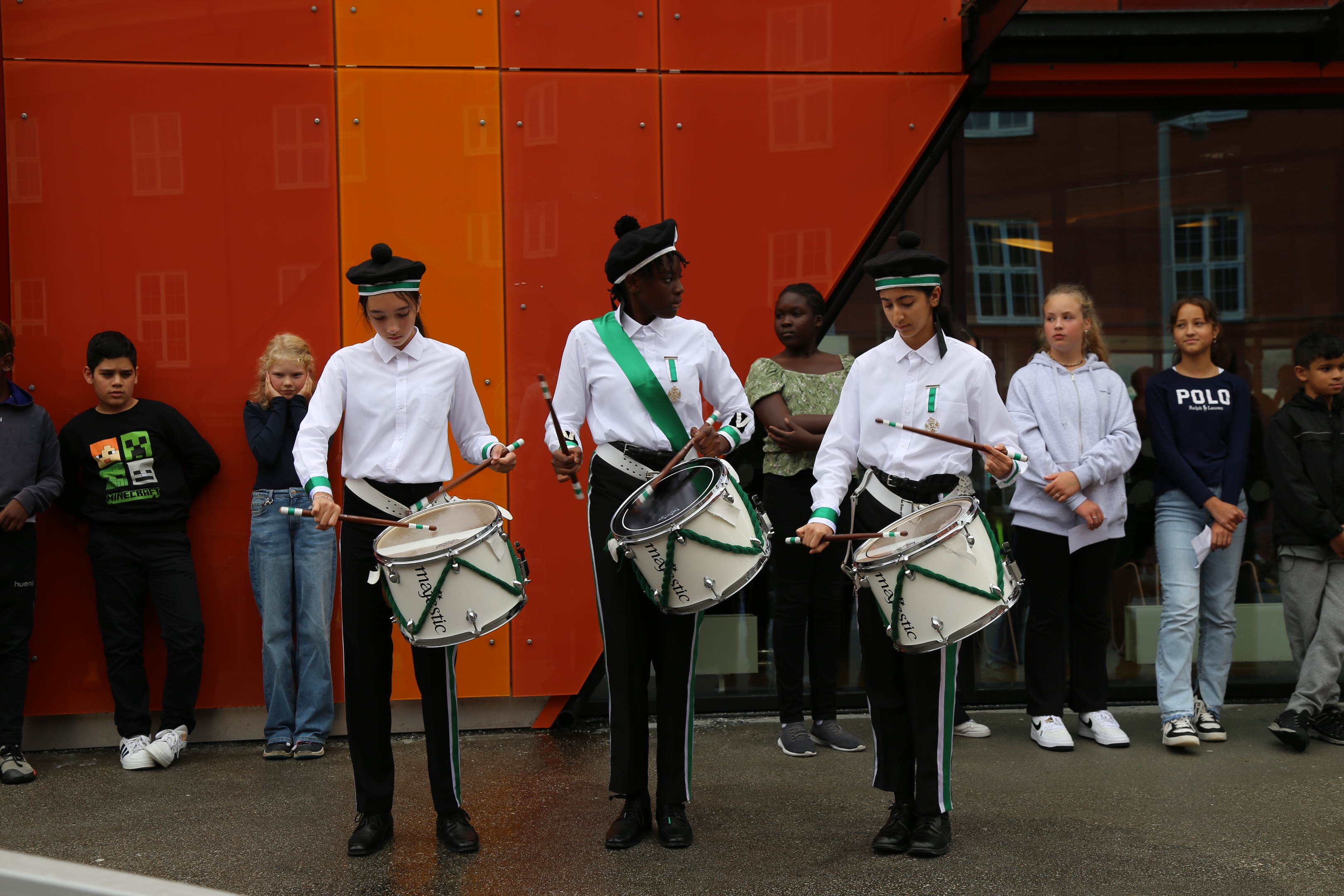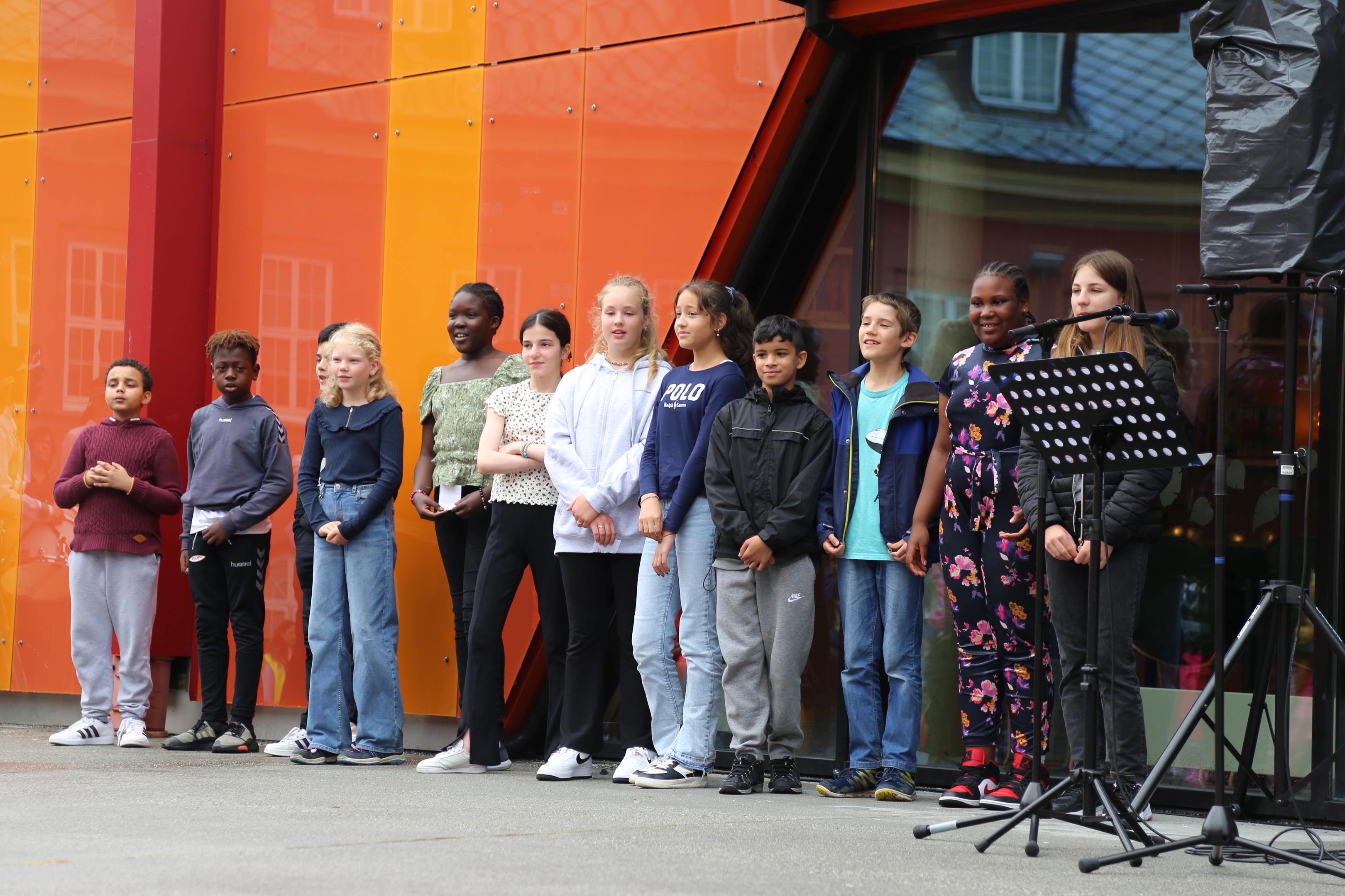 Elevene fra Ny-Krohnborg skole satte standarden for dagen med allsang på plassen utenfor det nye biblioteket som ble åpnet 25. august 2022.
