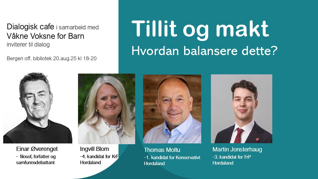 Tillit og makt. Hvordan balansere dette? Einar Øverenget er filosof, forfatter og samfunnsdebattant. Han innleder med en presentasjon av boka si: "Tillit - uunngåelig, nødvendig, farlig", der han aktualiserer temaet inn i dagens samfunnsdebatt. Videre har Dialogisk cafe invitert tre politikere fra stortingslistene for Hordaland. Ingvill K.Blom er 4. kandidat for KrF. Thomas Moltu er 1. kandidat for Konservativt. Martin Jonsterhaug er 3. kandidat for FrP.