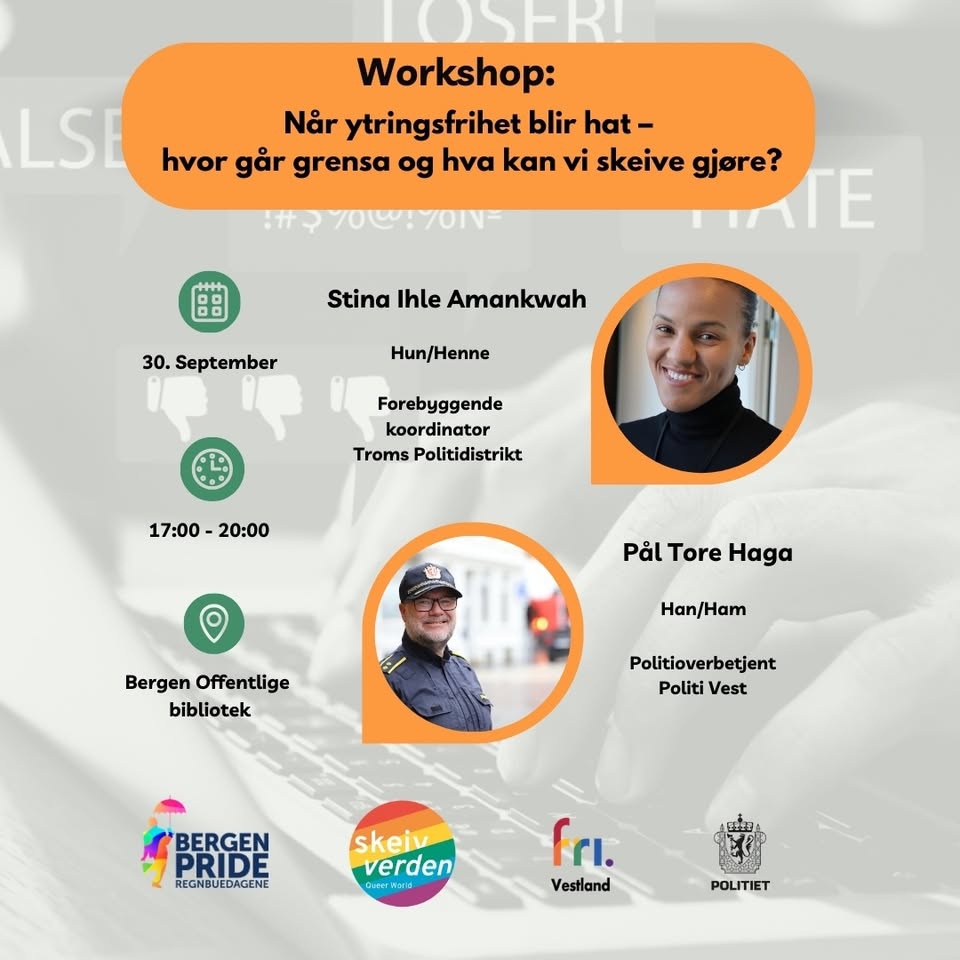 Denne kvelden samler vi politi, fagpersoner og skeive stemmer til en workshop om hatefulle ytringer.�