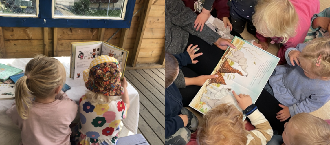 Barnehagen kan fortelle at de har etablert lesekroker og små biblioteker inne på avdelingene, i garderoben, på badet, ute i barnehagen og på tur. På denne måten skaper de både leseglede og fellesskap rundt bøker samtidig som bøkene gir barna støtte og hjelp i de forskjellige rutiner og overganger i løpet av dagen. I barnehagen er bøker et viktig grunnlag i prosjekter om temaer som natur, følelser, kropp og vennskap.
