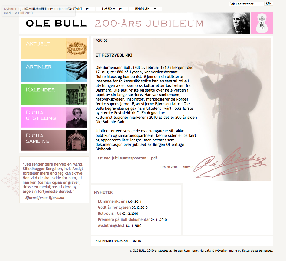 Jubileumsnettside for Ole Bornemann Bull, født 5. februar 1810 i Bergen, død 17. august 1880