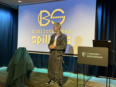 Ozan Drøsdal fra Perfectly Paranormal var tilstede, holdt tale og mottok det stilige trofeet laget av Hilde Mekker. Foto: Lillestrømbibliotekene.