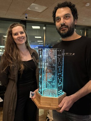 Trofeet holdt av Ozan Drøsdal, med Hilde Mekker som laget trofeet.
